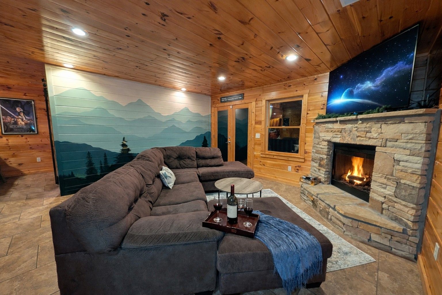 Lower level living room with sofa, TV, and fireplace