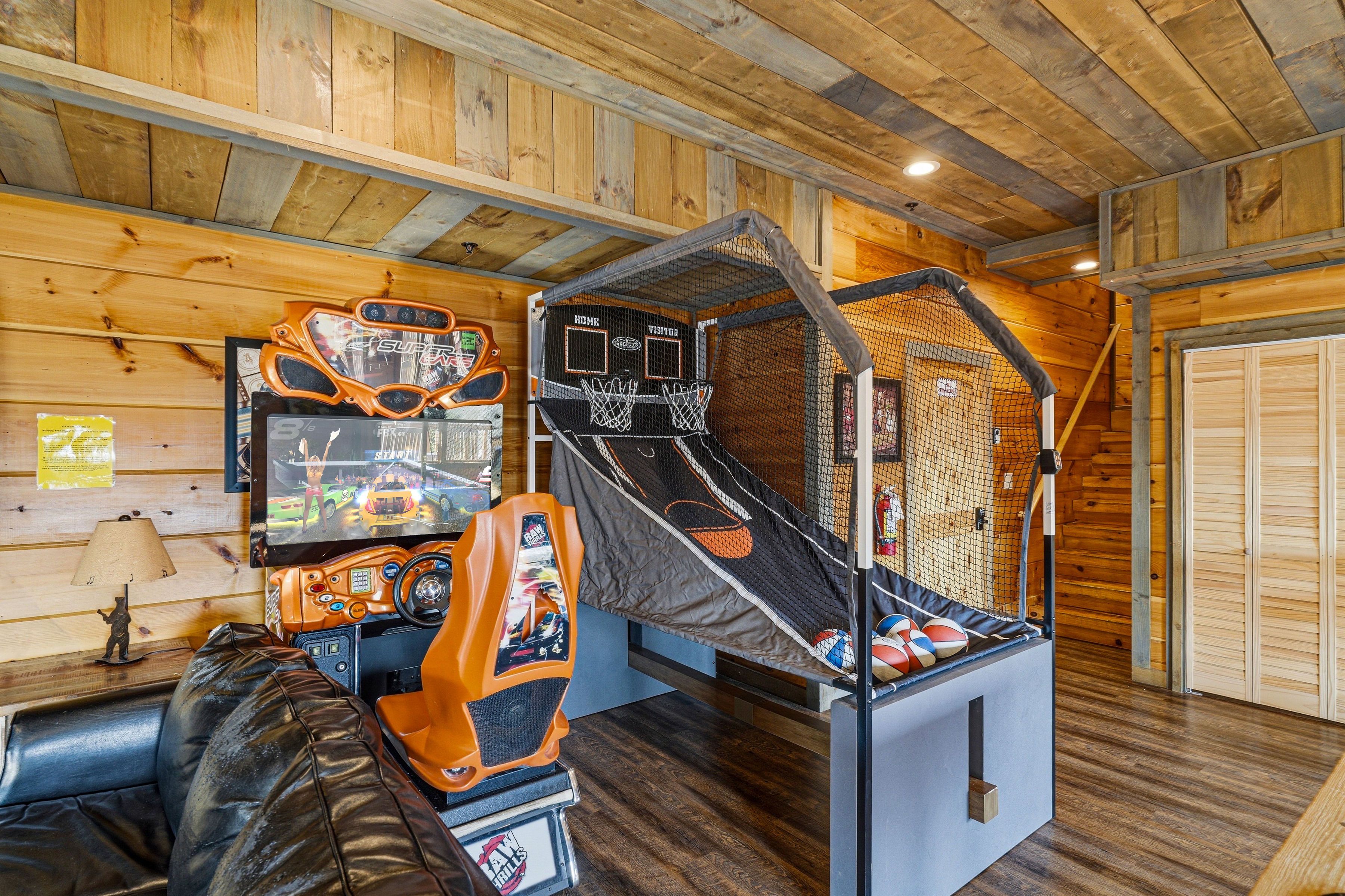 -Game Room with a pool table, multicade arcade system, hoops basketball, and driving simulator for friendly competition